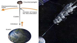 A space elevator would be a transportation system consisting of a cable anchored to the Earth's equator and extending into space. A counterweight in geostationary orbit would provide enough centrifugal force to keep the cable upright. Climbers would carry cargo up and down the cable. The most promising materials for the cable are carbon nanotubes, boron nitride nanotubes, and diamond nano-threads. While the concept and requirements for a space elevator have been proposed, current technology has only achieved testing on a much smaller scale, and significant engineering challenges remain before a full-scale space elevator could be built.