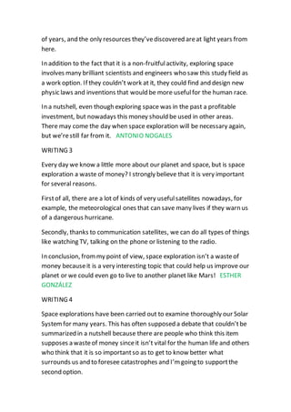 The document contains 8 writings from students with differing opinions on whether space exploration is a waste of money. Some key points made include: