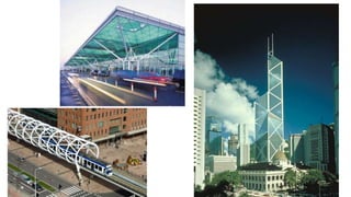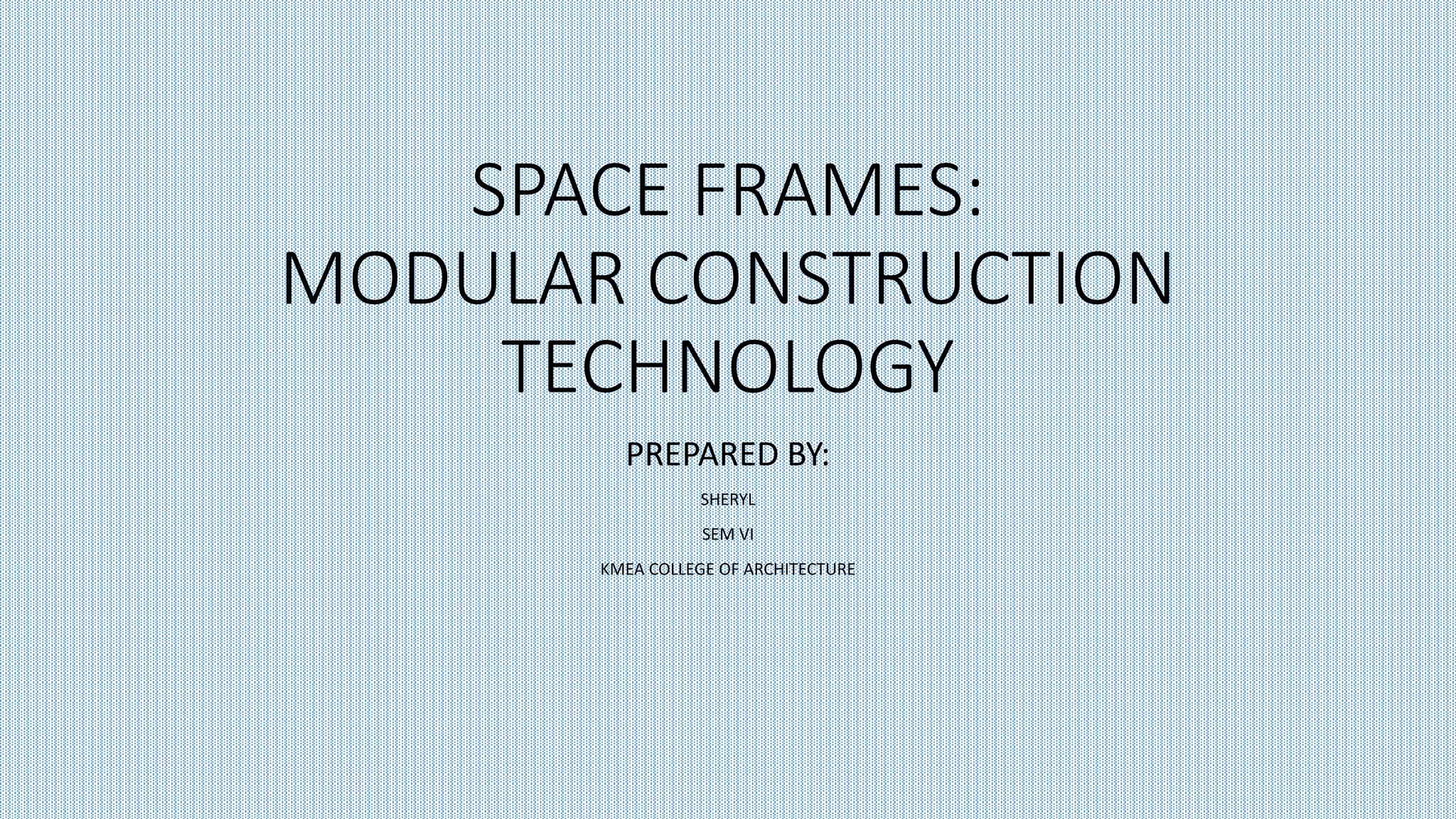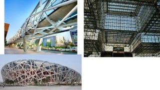 The document discusses space frames, which are lightweight truss-like structures constructed from interlocking struts in a geometric pattern. Space frames span large areas with few interior supports by transmitting loads through tension and compression along struts. They were developed in the early 1900s and came into wider use in the 1950s. Space frames are used for roofs, floors, and other structures requiring large clear spans. They offer advantages of light weight, prefabrication allowing low-cost construction, and versatility of shapes. Double-layer grids provide increased stiffness over single-layer designs.