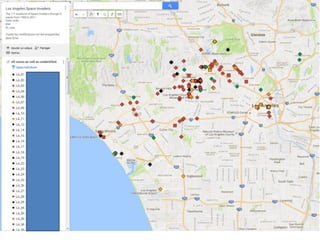 The document appears to be a compilation of references and data related to 'The Invasion of Los Angeles,' including numerous links to visual resources and archives. It includes a detailed list of la_XX identifiers which likely correspond to specific locations or elements of the subject matter. Most of the information derives from online sources without direct access to the original book or maps.
