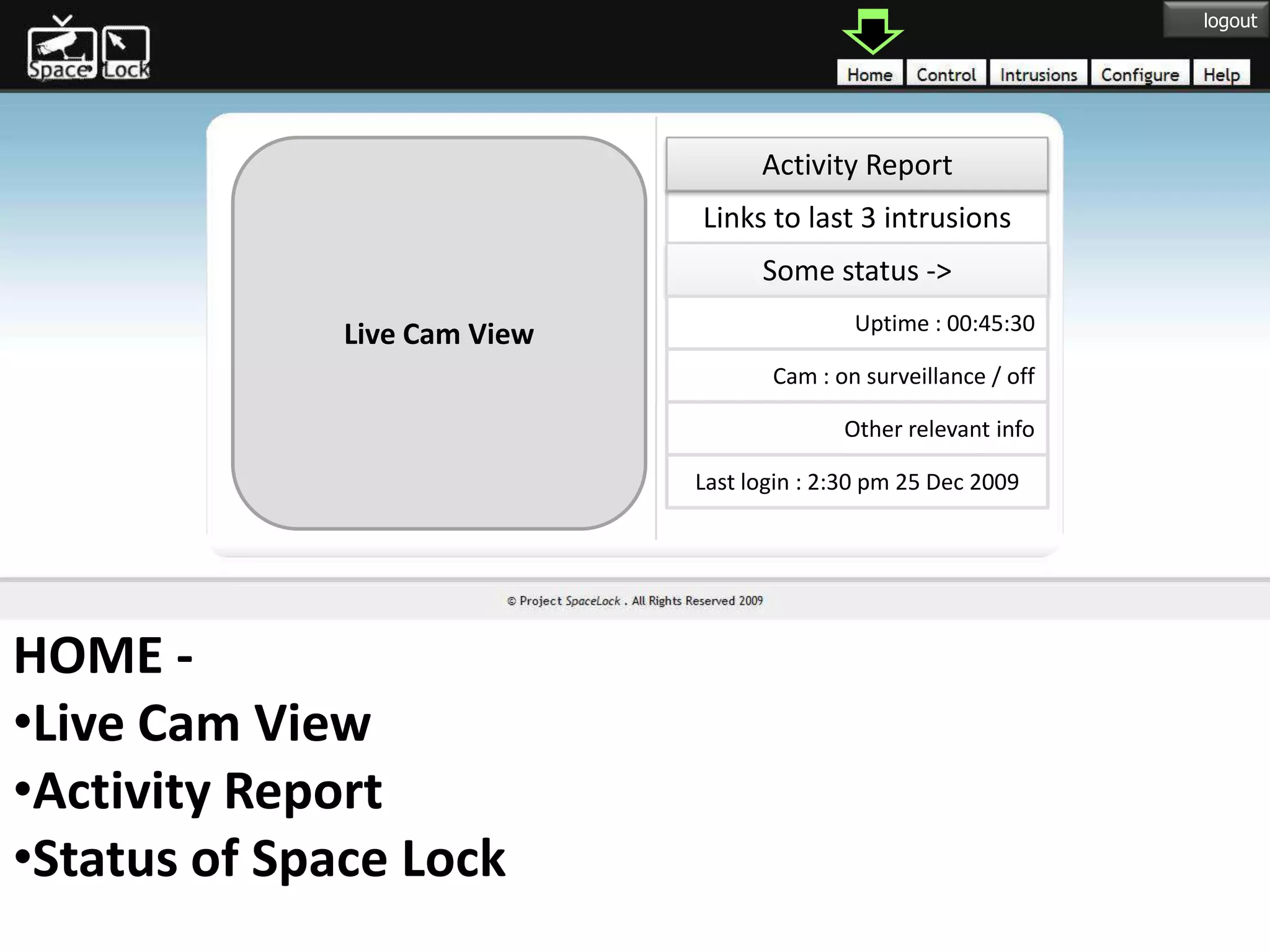 The document outlines the features and functionalities of a surveillance web interface, including a live cam view, activity reports, and intrusion detection capabilities. It provides details on login/logout procedures, monitoring intrusion events, and customizing settings for optimal use. Additionally, it mentions options for alerts, video archiving, and user help resources.
