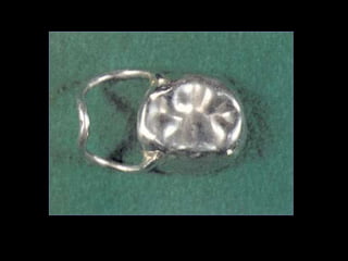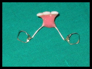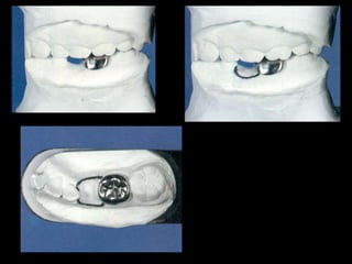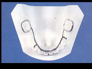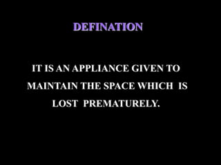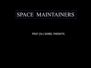 This document discusses space maintainers, which are appliances used to maintain space lost prematurely due to tooth extraction. It defines space maintainers and classifies them as fixed or removable, functional or non-functional, unilateral or bilateral, active or passive, with or without bands, and combinations. Requirements for space maintainers are outlined, and removable, fixed, and specific types of space maintainers like distal shoe and crown and loop are described, including their advantages, disadvantages, and indications for use. Planning factors for space maintainers like time since tooth loss and dental age are also covered.