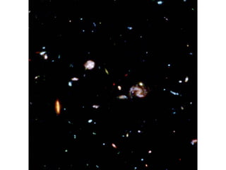 The document discusses the vastness of space and the universe. It notes that Antares is over 1000 light years away and one of the brightest stars. It then shows an image from the Hubble telescope of countless galaxies billions of light years away and a close up of one of the darker regions, highlighting how small and insignificant humans are in the vast universe. It encourages keeping life's problems in perspective.