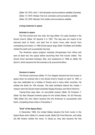 The document summarizes the Space Race between the US and USSR from 1957 to 1969. It describes early satellite launches like Sputnik 1 and 2, and the first animals and humans sent into space. Key events included Yuri Gagarin becoming the first human in space in 1961, followed by Alan Shepard and John Glenn for the US. The Space Race concluded with the US achieving the major goal of landing astronauts on the Moon in 1969, led by Neil Armstrong and Buzz Aldrin on Apollo 11.