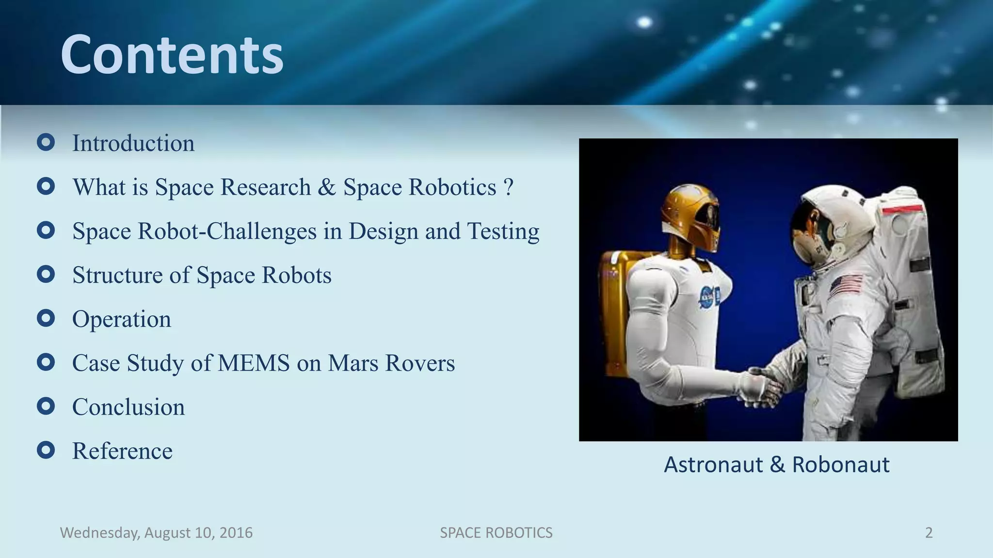 This document discusses a case study on the integration of microelectromechanical systems (MEMS) on Mars rovers. It first provides background on space robotics and discusses challenges in designing robots for space like withstanding zero gravity and thermal vacuums. It then examines the structures of space robots including their joints, arms, wrists, and grippers. Specific examples of space robots are described like the shuttle robot arm and rovers on Mars. The case study focuses on how MEMS have been implemented on later Mars rovers to help enable scientific exploration of the planet. In conclusion, robots have played a huge role in space research by performing dangerous tasks and making discoveries in place of humans.