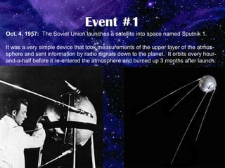 The document provides a history of major events in space exploration from 1957 to 1998. It begins with the Soviet Union launching Sputnik 1 and Sputnik 2, carrying the first animal into space. The US launched its first satellites Explorer 1 and Vanguard 1 in response. NASA was formed in 1958 to lead US space initiatives. The space race then involved firsts such as putting humans into space and on the moon. International cooperation grew over time, culminating in the launch of the International Space Station module in 1998.