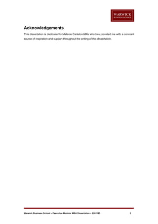 This document is an executive MBA dissertation submitted by Mark Morley to the University of Warwick in 2006. The dissertation examines the viability of establishing a low-cost sub-orbital space business in the UK to provide launch services for scientific payloads and emerging space tourism. The dissertation reviews the current global space industry, sub-orbital sounding rocket and space tourism markets. It also analyzes the strategies of Starchaser Industries, a UK-based space company, and assesses Starchaser's potential to compete in these emerging markets through surveys of universities and consumers. The aim is to determine if a low-cost space venture can be established in the UK without government funding.