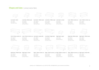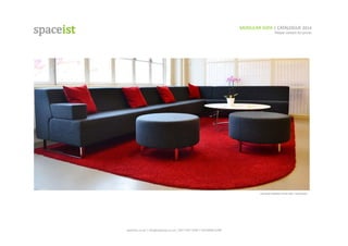 The document is a comprehensive catalogue for Spaceist's modular sofas, detailing various styles, dimensions, and materials available, including options for low and high backs, stools, and booth seating. It emphasizes customizable features such as upholstery in contract vinyl or fabric and highlights the company’s commitment to quality in design and assembly. Contact information and terms regarding VAT and delivery are also provided, along with client testimonials and additional services like furniture assembly and old furniture removal.