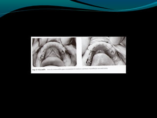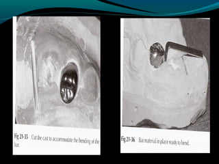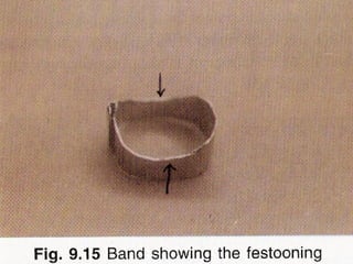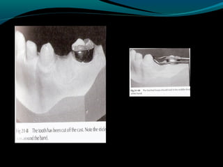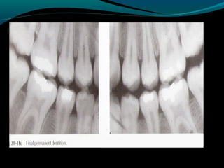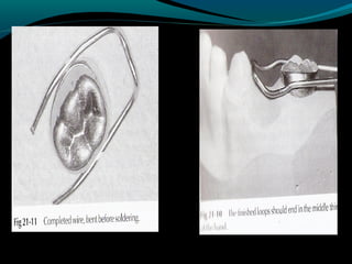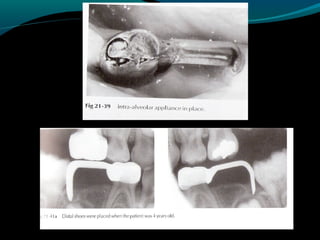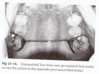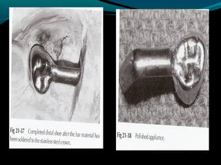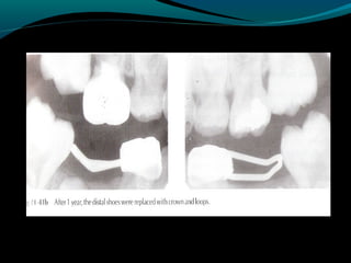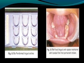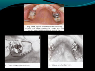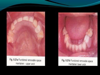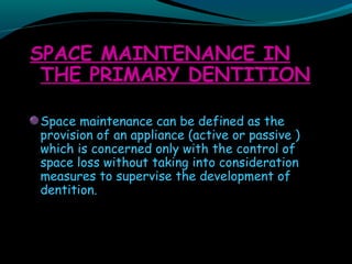 Space maintainers are appliances used to maintain space or regain minor amounts of space lost after a primary tooth is lost. There are several types of space maintainers including fixed appliances like band and loop, lingual arch, and distal shoe appliances as well as removable partial dentures. Key factors in determining the appropriate space maintainer include the time since tooth loss, development of the permanent tooth, and amount of bone covering the unerupted tooth. The document provides details on the construction, advantages, and disadvantages of various space maintainer options.