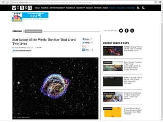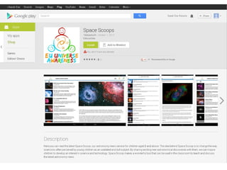 This document provides an overview of Space Scoop, an astronomy news service for kids. Space Scoop shares the latest scientific discoveries with children by translating press releases into short, simple summaries. It aims to enhance kids' understanding of the world and encourage critical thinking. Space Scoop summaries follow standards for adult press releases by using short sentences, avoiding jargon, relating science to real life, and sticking to one or two new concepts. Since 2011, Space Scoop has published 188 summaries in 22 languages and received over 100,000 page views. It disseminates its content through various print, audio, and video mediums to reach broad audiences.