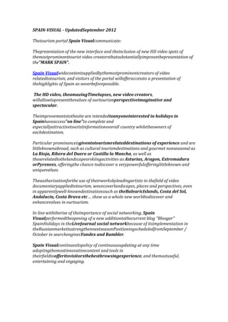 Spain Visual updated its tourism portal in September 2012 with a new interface and HD video spots from prominent tourism video creators to substantially improve the presentation of Spain as a destination. The portal offers access to highlights of Spain through high quality video and timelapses, allowing destinations to be presented from an imaginative and spectacular perspective. Improvements are intended to give anyone interested in holidays in Spain complete and attractive tourist information on destinations, particularly those related to experiential, cultural, or non-seasonal tourism as well as landscapes and outdoor activities.