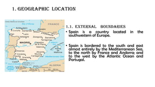 Spain is located in southwestern Europe. It is bordered by France, Andorra, Portugal and the Mediterranean Sea. Spain has a high average altitude of 660 meters and is dominated by a central plateau and mountain ranges. The highest peak is Teide at 3,718 meters, located on the Canary Islands. The longest river is the Ebro, which flows 930 km eastward into the Mediterranean. Spanish is the official language, along with Galician, Basque and Catalan in some regions. Madrid is the capital city. Spain has 17 autonomous communities and 2 autonomous cities, Ceuta and Melilla. Spanish culture includes famous historical monuments, festivals like Holy Week and Fallas, traditional costumes, and