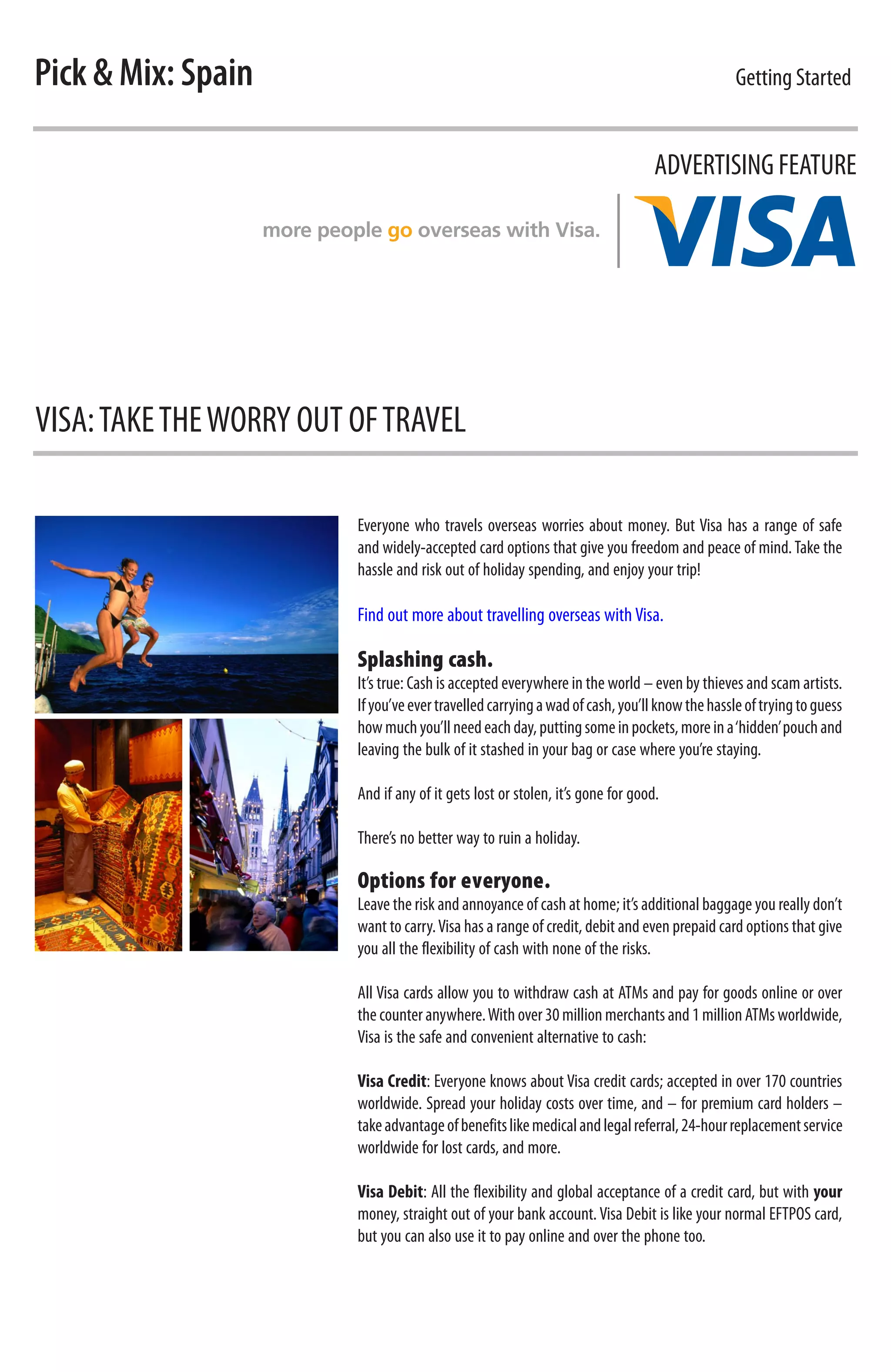Visa offers a range of credit, debit, and prepaid card options that allow travelers to avoid the hassle and risk of carrying large amounts of cash while traveling abroad. Visa cards can be used to withdraw cash from ATMs and make purchases anywhere that accepts Visa cards. They offer benefits like global acceptance at over 30 million merchants and 1 million ATMs worldwide, reimbursement if the card is lost or stolen, and 24/7 assistance. More travelers choose Visa because of its widespread acceptance and security features.