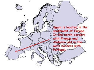 Spain is located in southwest Europe and borders France, Portugal, and Andorra. There are 17 autonomous communities within Spain, each with their own unique cultures, languages, popular festivals, and foods. The capital of Spain is Madrid.