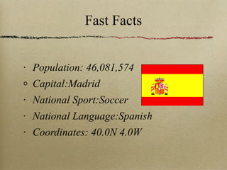 Spain has a population of over 46 million people and its capital is Madrid. The country has over 1,800 rivers and streams and a variety of climates due to its mountainous terrain. Spanish culture was heavily influenced by both the Romans and Latin cultures, seen in its architecture, art, and festivals. Common traditions in Spain include playing soccer, flamenco dancing, and celebrating Christmas from December 8th to January 6th. The running of the bulls in Pamplona and bullfighting are also famous Spanish traditions that attract tourists. Spain has a long history of settlement and conquest by different groups over millions of years.