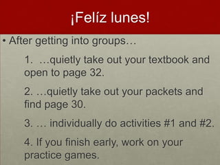 Students are instructed to get into groups and take out their textbooks and packets. They are to individually complete activities 1 and 2 from page 30 of their packets. If finished early, they can work on practice games. The schedule for the class includes watching a video, learning about subject pronouns and verbs, and completing activities 3 through 6 on page 31 of their textbooks. Homework is to complete exercises 1 and 2 in their notebooks.