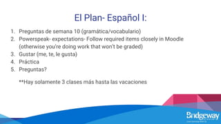 The class will also cover imperfect tense for the Spanish II level students and include practice writing in the past about life as a child. There are only 3 classes remaining until the holidays.