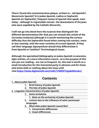 Judeo-Spanish, also known as Ladino or Sephardic Spanish, is a variant of Spanish that was spoken by Jews expelled from Spain in 1492. It preserves some archaic features of medieval Spanish and also incorporates vocabulary influences from other languages. While once widely spoken in places like the Balkans, Judeo-Spanish is now highly endangered and close to extinction as its speakers were killed in the Holocaust or emigrated from areas where it was traditionally used. The language differs phonologically from modern Spanish in its retention of distinct sibilant phonemes and in features like the pronunciation of final vowels.