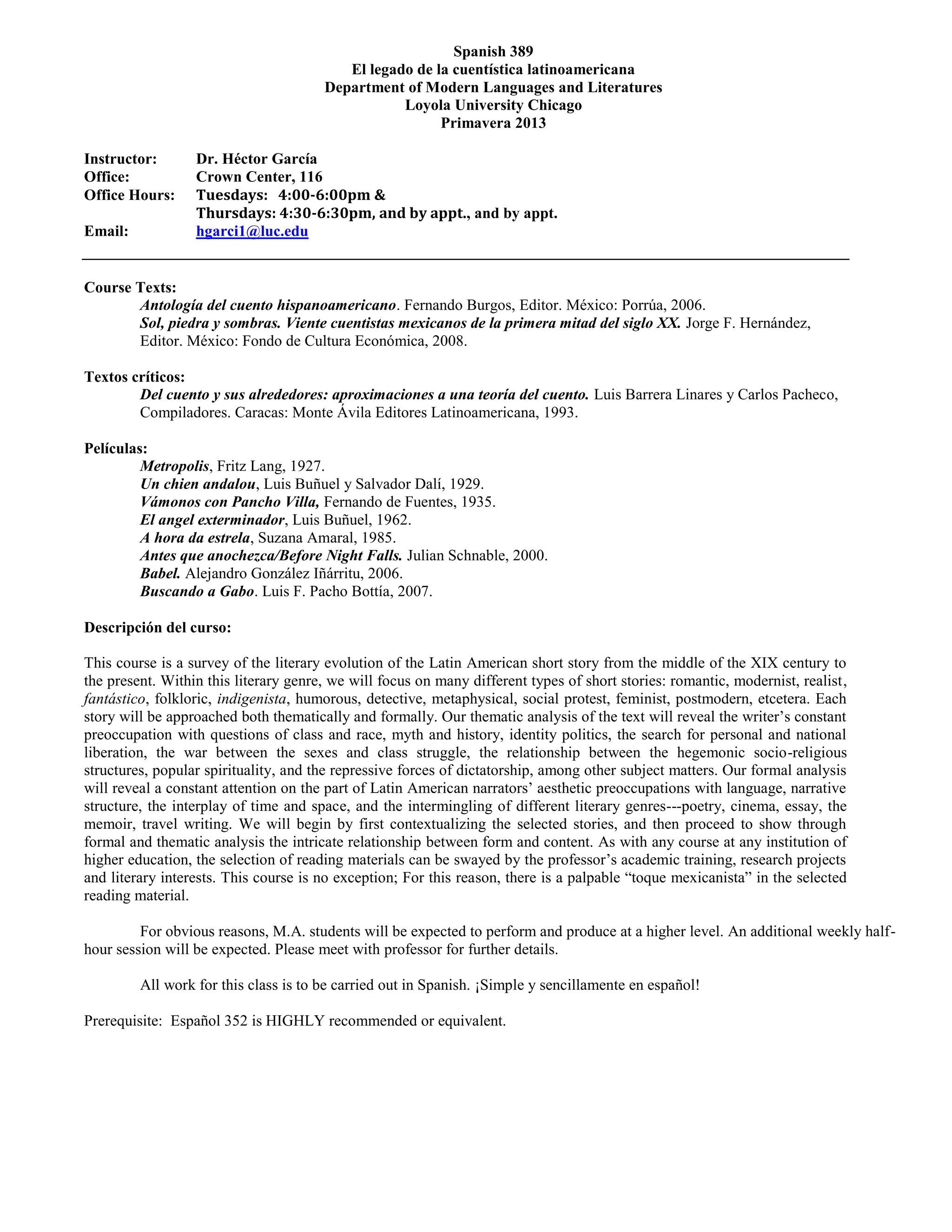 This document provides the syllabus for a Spanish literature course titled "El legado de la cuentística latinoamericana" or "The Legacy of Latin American Short Fiction". The course is taught in Spanish and surveys the evolution of the Latin American short story genre from the 19th century to present. It will examine various styles and themes of short stories from different regions and time periods. Students will analyze stories formally and thematically, discussing topics like class, race, identity, and politics. They will be evaluated based on attendance, presentations, papers, tests, and a final exam. The course aims to help students better understand the relationship between form and content in Latin American short fiction.