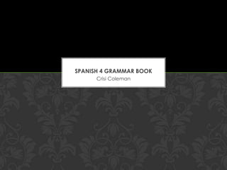 This document contains a table of contents and sections for a Spanish 4 grammar book. It covers topics such as the present tense, ser and estar, gustar expressions, preterite vs imperfect tenses, commands, object pronouns, possessive adjectives and pronouns, demonstrative adjectives and pronouns, reflexives, por vs para prepositions, and verbs to express becoming something.