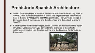 Spanish architecture has a long and varied history, from ancient burial chambers built in 4000BC to modern works. Notable periods include Roman architecture which introduced civil engineering like aqueducts and roads, Gothic cathedrals built in the 12th-13th centuries, Renaissance palaces in the 15th-16th centuries like El Escorial, and Barcelona's iconic buildings by Gaudi in the 20th century Catalan Modernism style. Spain has a wealth of architectural styles and UNESCO World Heritage Sites that showcase its rich architectural history.