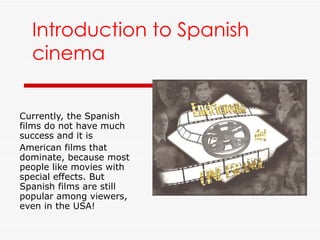 Spanish cinema is currently less successful than American films which rely more on special effects, though Spanish films still have popularity in the US. The document discusses famous Spanish actors like Antonio Banderas and actresses including Penélope Cruz and Maribel Verdu. It also notes common themes in Spanish films like love, bullfighting and emigration and highlights some recent acclaimed movies nominated for Oscars or featuring Penélope Cruz that have found worldwide audiences.