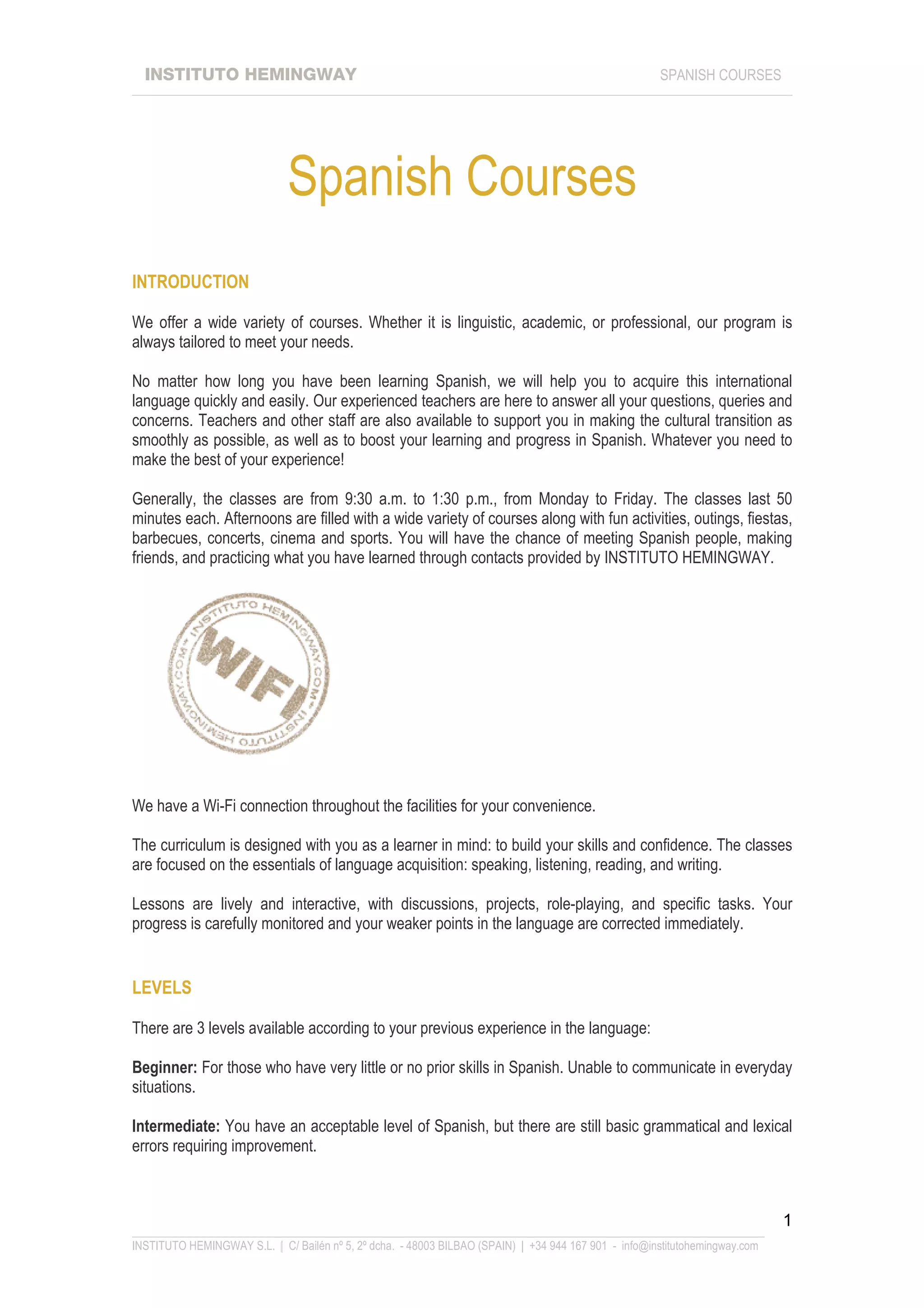 Instituto Hemingway offers a variety of Spanish courses tailored to different levels (beginner, intermediate, advanced) with a focus on communication skills and cultural integration. Classes run from Monday to Friday, including interactive sessions and extracurricular activities, with resources like books and internet access provided for free. Additional programs such as business Spanish and intensive courses are available, emphasizing practical language use for diverse needs.