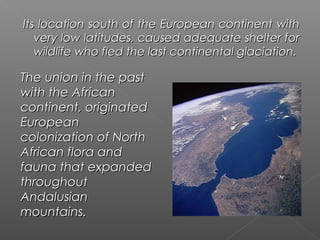 The document summarizes the unique environmental features of the Sierra Nevada mountains and surrounding areas in Spain. It notes that the region has over 2,000 plant species, including 66 endemic species, due to its varied climates and past connection to Africa. It is also home to unique animal species like the Alpine accentor that lives in the high mountains year-round. The region has preserved its historic villages and agriculture despite its arid climate and isolation between the mountains and sea.