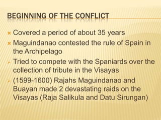 This document summarizes the Spanish-Moro wars between Spain and the Sultanates in the Philippines over a period of 35 years. It describes the initial raids by the Moro sultanates on Spanish settlements in the Visayas in the late 1500s. This led to retaliatory attacks by Spain and periods of tense peace. Major events included the 1635 Spanish building of a fort in Zamboanga, and warfare led by the Sultan Kudarat in the 1630s-1640s contesting Spanish expansion. While Spain had some successes capturing Moro coastal areas and forts, they struggled to fully conquer the sultanates in Mindanao and Sulu due to resistance and other geopolitical threats