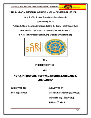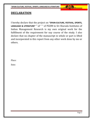 The document provides an overview of Spain, including its people, economy, educational system, and history. Key points include that Spain has a population of over 47 million people, with Spanish as the main language. The economy relies on services and tourism, and has high unemployment. Education is compulsory until age 16. Historically, Spain was influenced by Phoenicians, Greeks, Carthaginians, Romans, Moors, and the Spanish Empire declined in the 16th century. Franco ruled from 1939 until democracy was established in the late 1970s.