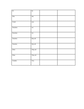 Pronouns are words that take the place of nouns. In Spanish, pronouns are used to refer to third person subjects (singular or plural) when their gender or number needs to be specified. Unlike in English, Spanish pronouns are often omitted because the conjugated verb ending identifies the subject. The major types of Spanish pronouns include those that refer to the first person (yo, nosotros), second person (tu, ustedes, vosotros), and third person (el, ella, ellos, ellas). A chart is also provided listing common Spanish pronouns and notes on their conjugation.