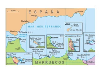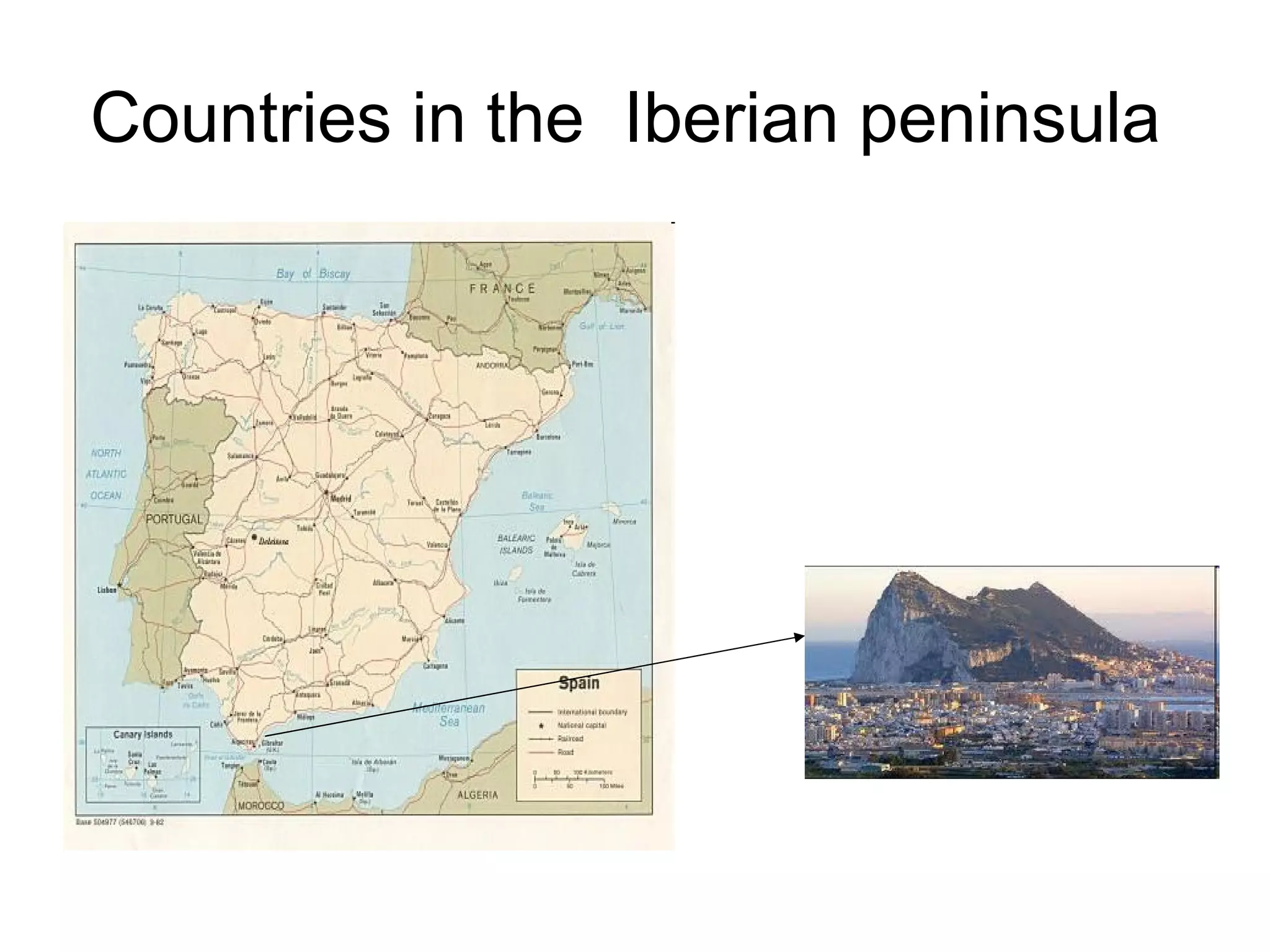 Spain is located in Europe on the Iberian Peninsula. The peninsula has rugged terrain with mountain ranges and plateau regions. The Central Plateau is located in the center of the peninsula and divides it into northern and southern subplateaus. Major mountain ranges that surround and divide the plateau include the Pyrenees, Iberian System, and Betic System. Coastlines include the Cantabrian Sea, Mediterranean Sea, and Atlantic Ocean.