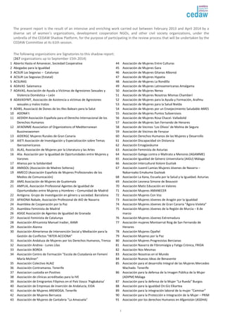 The report details the efforts of various women's organizations and NGOs in Spain during the 2013-2014 period to participate in the review process of the Convention on the Elimination of All Forms of Discrimination Against Women (CEDAW). It outlines the collective commitment by 267 signatory organizations to advocate for the elimination of discrimination and to promote gender equality through this shadow report for CEDAW's 61st session. Key issues addressed include ongoing gender discrimination, lack of sufficient protective measures for at-risk groups, and the need for better monitoring of policies aimed at advancing women's rights.