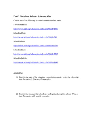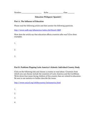 This document provides instructions and questions for a Spanish education webquest. Students are asked to read articles about the influence of education on post-war countries and issues facing children's education in Latin America. They then choose an article about educational reform in one Latin American country to answer questions about conditions before and changes during the reform, and reflect on an interesting photo from the article.