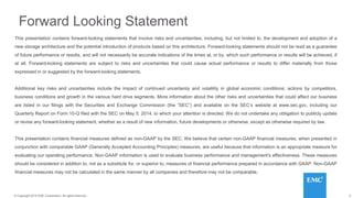 2© 2014 HGST,INC. ALL RIGHTS RESERVED. 2© Copyright 2014 EMC Corporation. All rights reserved. Forward Looking Statement This presentation contains forward-looking statements that involve risks and uncertainties, including, but not limited to, the development and adoption of a new storage architecture and the potential introduction of products based on this architecture. Forward-looking statements should not be read as a guarantee of future performance or results, and will not necessarily be accurate indications of the times at, or by, which such performance or results will be achieved, if at all. Forward-looking statements are subject to risks and uncertainties that could cause actual performance or results to differ materially from those expressed in or suggested by the forward-looking statements. Additional key risks and uncertainties include the impact of continued uncertainty and volatility in global economic conditions; actions by competitors, business conditions and growth in the various hard drive segments. More information about the other risks and uncertainties that could affect our business are listed in our filings with the Securities and Exchange Commission (the “SEC”) and available on the SEC’s website at www.sec.gov, including our Quarterly Report on Form 10-Q filed with the SEC on May 5, 2014, to which your attention is directed. We do not undertake any obligation to publicly update or revise any forward-looking statement, whether as a result of new information, future developments or otherwise, except as otherwise required by law. This presentation contains financial measures defined as non-GAAP by the SEC. We believe that certain non-GAAP financial measures, when presented in conjunction with comparable GAAP (Generally Accepted Accounting Principles) measures, are useful because that information is an appropriate measure for evaluating our operating performance. Non-GAAP information is used to evaluate business performance and management's effectiveness. These measures should be considered in addition to, not as a substitute for, or superior to, measures of financial performance prepared in accordance with GAAP. Non-GAAP financial measures may not be calculated in the same manner by all companies and therefore may not be comparable.