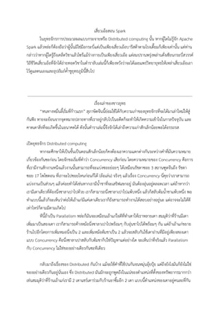 เปนเฟรมเวิรคแบบโอเพนซอสที่ใชประมวลผลขอมูลแบบกระจายที่มี ลักษณะการประมวลผลแบบทั่วไป พอแปลตรงๆ แลวฟงดูแปลกๆ แตใหเขาใจวามันไมไดถูกออกแบบมาเพื่อ งานใดโดยเฉพาะ มันจึงสามารถถูกปรับใชไดกับงานหลายๆ อยาง ซึ่งโดยปกติแลวคาเริ่มตนของมันถูกกําหนด ใหประมวลผลบนหนวยความจํา และหนวยความจําที่กลาวถึงตอไปก็จะเปนพวก RAM อะนะ (เดี๋ยวโดนวา หนวยความจํามีหลายแบบ บลาๆๆ) เอาตอ! ทีนี้ Spark เองก็สนับสนุนใหเกิดพวก ETL หรือ Extract - Transform - Load นะ ซึ่ง Extract คือขั้นตอนการเอาขอมูลจากแหลงอื่นที่อาจจะมีรูปแบบการเก็บแตตาง กัน มา Transform ใหเปนรูปแบบที่เราอยากได จากนั้น Load เขาไปเก็บใน Data warehouse ซึ่งตัว Spark เองก็สามารถทํากลไก ETL ที่กลาวไปนี้ได หรือจะทําการวิเคราะหขอมูล การทํา Machine learning รวมทั้ง การประมวลผลแบบกราฟ ซึ่งทั้งตัว Batch บนขอมูลที่ถูกเก็บอยูแลวและตัว Streaming บนขอมูลที่มีการ เปลี่ยนแปลงตามเวลาเปน Time series ไดดวย จากภาพจะขอโฟกัสไปที่ตัวขนมชั้นที่อยูตรงกลางคือชั้นที่เปนของ Spark Core ซึ่งเปนหัวใจของเคล็ดวิชาซึ่ง เกือบทั้งหมดของตําราเลมนี้ก็จะวากันดวยเรื่อง Spark Core นี่เอง จากนั้นขอใหยายหางตาไปเหลือบมองดาน บนที่เปนสวน เสร็จแลวจึงจะเหลาดานลางตอไป Spark Core สวนนี้เรียกไดวาเปนหัวใจของ Spark เลยก็วาไดเนื่องจากวาเปนตัวที่ใชเอาใหใหสวนอื่นๆ ที่เปน สวนประกอบยอยที่เปนไลบรารี่ เชน Spark SQL หรือ MLlib เขามาติดตอเพื่อใชงาน หรือเราจะใชวิธีเขียน โคดเพื่อเชื่อมตอกับ Spark เขาไปตรงๆ ก็ไดเหมือนกัน โดยที่กลไกการจัดการเชน Scheduler ที่เอาไวจัดการ งาน รวมทั้งกลไกการจัดการหนวยความจํา กลไกกูคืนขอผิดพลาดลวนแตอยูในสวนนี้ทั้งสิ้น