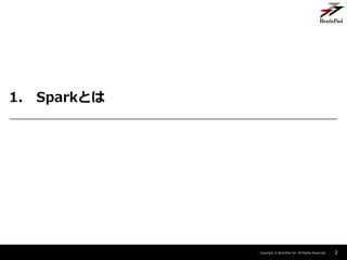 株式会社ブレインパッドが行ったApache Sparkの検証作業に関する資料の一部(Apache Sparkの基本的な紹介)です。詳細は、ブレインパッド公式ブログ「Platinum Data Blog」をご覧ください。URL:http://blog.brainpad.co.jp/