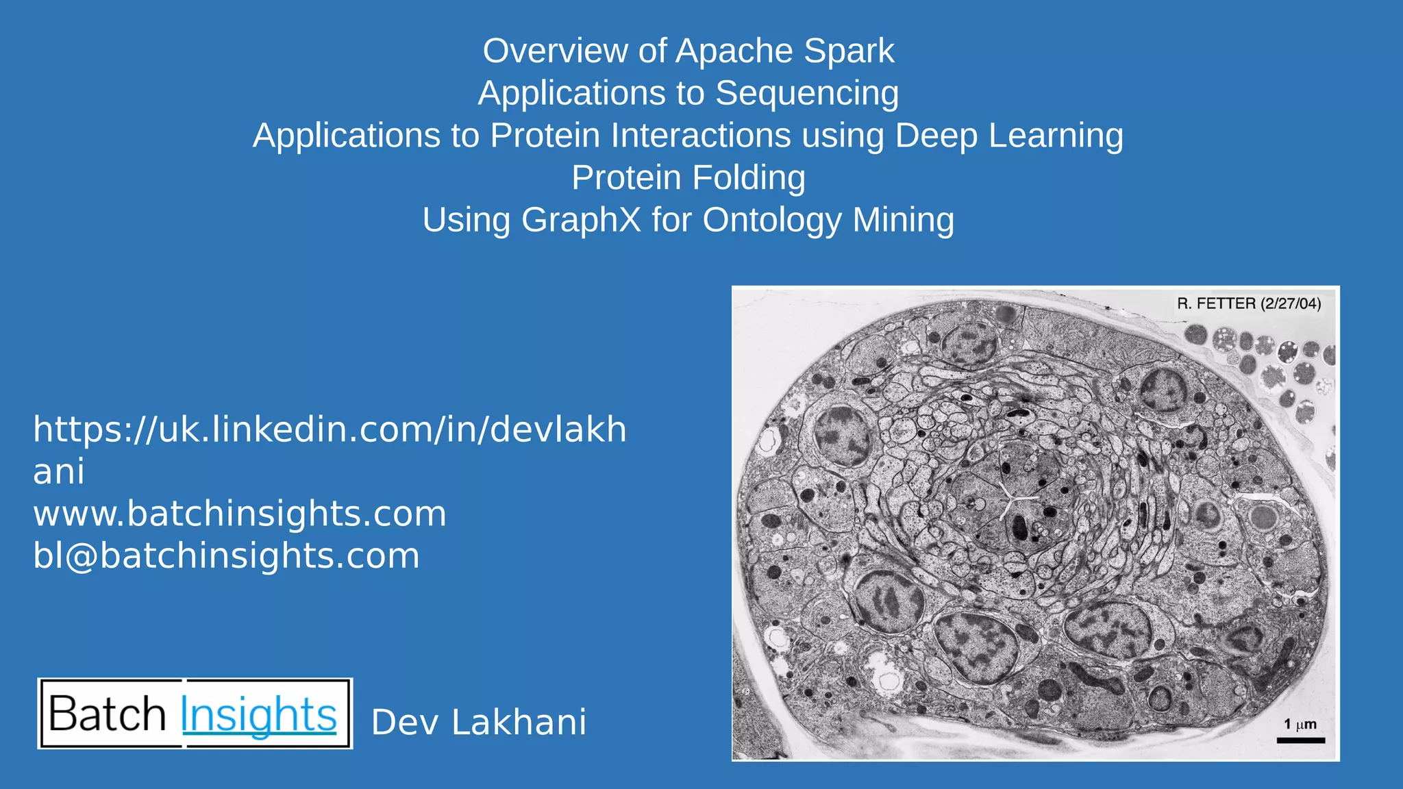 The document discusses the applications of Apache Spark in life sciences, particularly in systems biology and deep learning for protein interaction and folding analysis. It highlights the challenges of processing large datasets and emphasizes the use of distributed and in-memory processing frameworks for tasks such as RNA-seq analysis and ontology mining. Additionally, it outlines various use cases, including virtual drug screening and disease modeling.