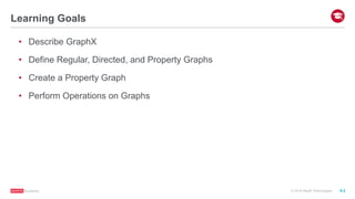 This document provides an introduction to GraphX, which is an Apache Spark component for graphs and graph-parallel computations. It describes different types of graphs like regular graphs, directed graphs, and property graphs. It shows how to create a property graph in GraphX by defining vertex and edge RDDs. It also demonstrates various graph operators that can be used to perform operations on graphs, such as finding the number of vertices/edges, degrees, longest paths, and top vertices by degree. The goal is to introduce the basics of representing and analyzing graph data with GraphX.