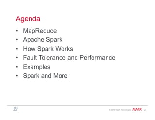 The document provides an overview of Apache Spark and its comparison with MapReduce, highlighting its advantages such as ease of use, performance, and in-memory data processing capabilities. It introduces key concepts like Resilient Distributed Datasets (RDDs), fault tolerance, and the platform's support for multiple programming languages. Examples of practical applications, such as word counting and log mining, demonstrate Spark's functionality and efficiency in handling big data tasks.