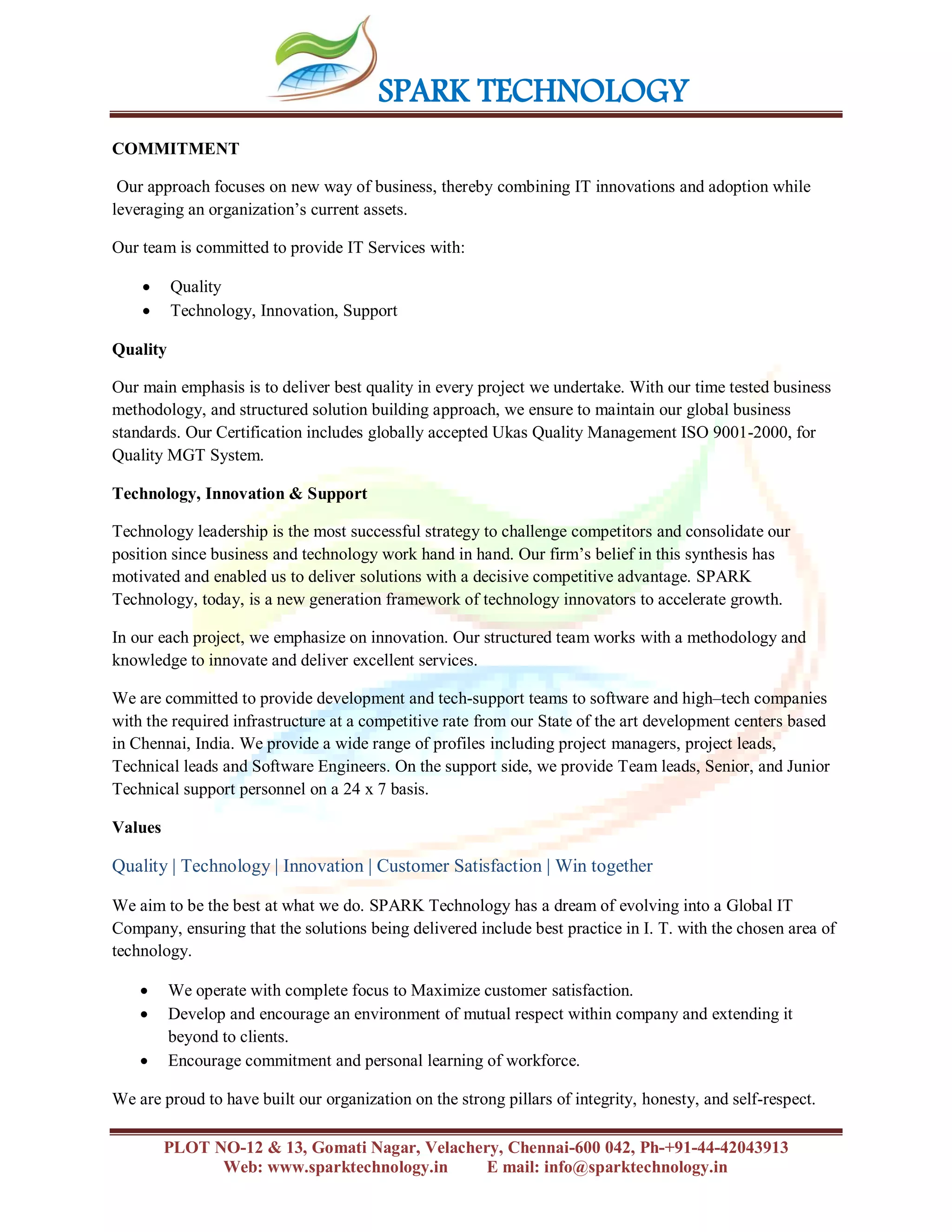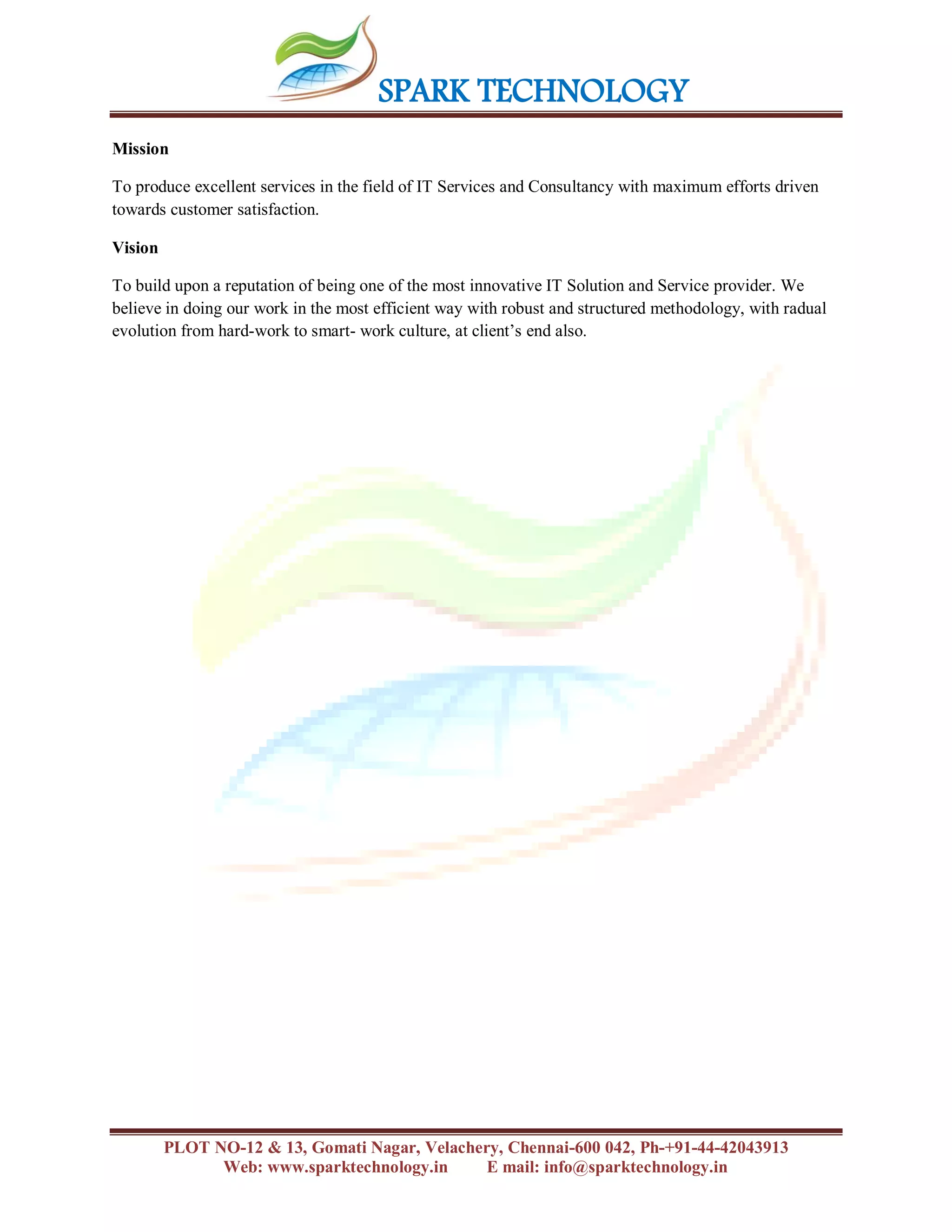 SPARK Technology is an IT services and consulting firm based in Chennai, India. It provides a wide range of services including software solutions, web development, graphic design, networking, quality assurance testing, and application maintenance and support. The company aims to deliver high quality services with a focus on technology, innovation, and customer satisfaction. It has a team of experts across various domains and technologies and state-of-the-art infrastructure to efficiently undertake projects.