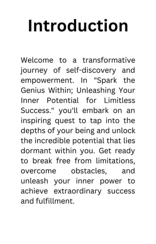 'Spark the Genius Within; Unleashing Your Inner Potential for Limitless Success' is a transformative guide for self-discovery and empowerment, aimed at helping readers unlock their dormant potential. The book encompasses strategies for building confidence, embracing passions, practicing mindfulness, and developing leadership qualities to achieve personal and professional fulfillment. Through practical exercises and inspiring stories, the author encourages readers to overcome obstacles and ignite their inner brilliance for extraordinary success.