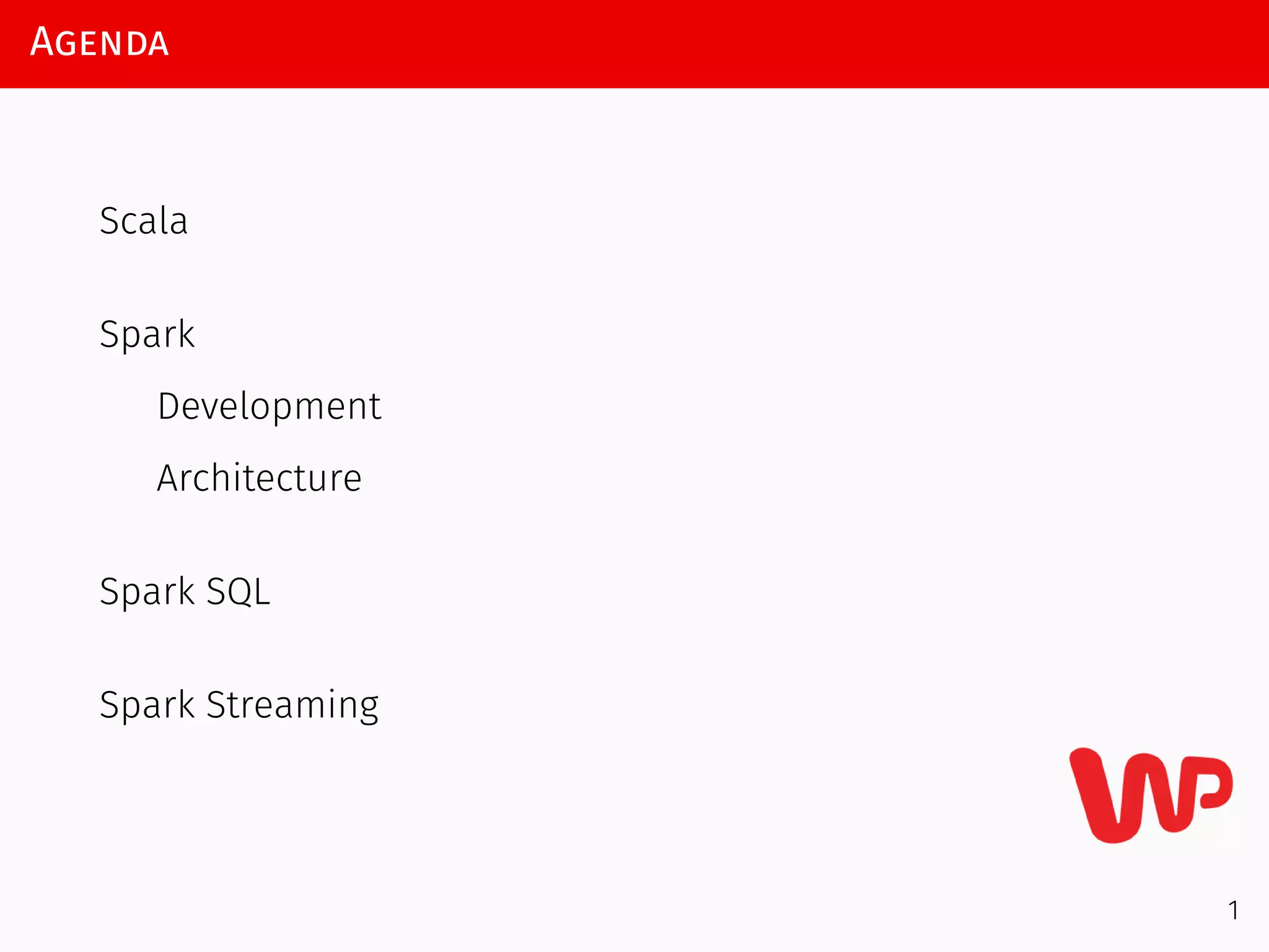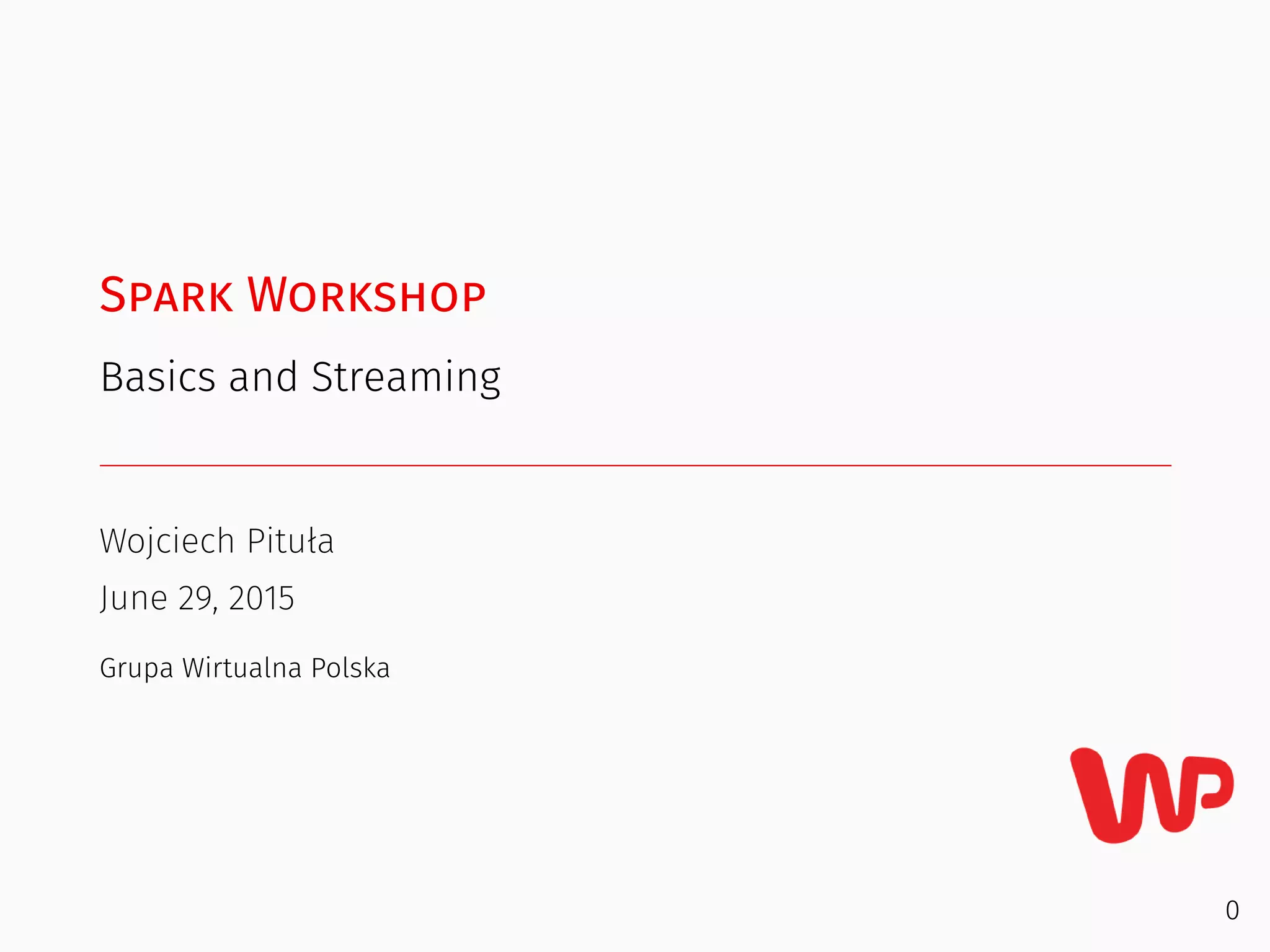 This document provides an agenda and overview for a Spark workshop covering Spark basics and streaming. The agenda includes sections on Scala, Spark, Spark SQL, and Spark Streaming. It discusses Scala concepts like vals, vars, defs, classes, objects, and pattern matching. It also covers Spark RDDs, transformations, actions, sources, and the spark-shell. Finally, it briefly introduces Spark concepts like broadcast variables, accumulators, and spark-submit.