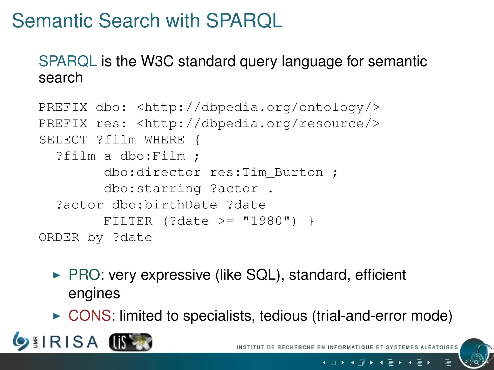 Sparklis is a web application designed to enhance semantic search using SPARQL, aiming to balance expressivity and usability for a broad audience. It allows users to perform natural language queries, navigate through entities, and utilize faceted search without requiring knowledge of SPARQL. The application has been in use since April 2014 and supports numerous endpoints, providing access to various domains with features that simplify querying and improve data interaction.
