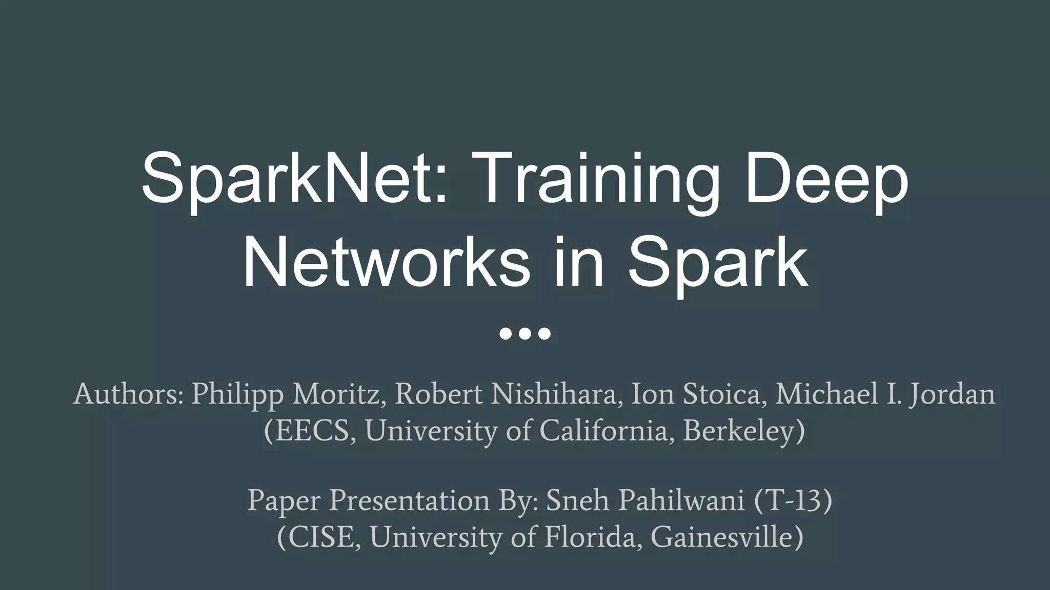SparkNet is a scalable framework for training deep networks on Apache Spark and Caffe, allowing asynchronous, distributed processing with minimal hardware needs. It utilizes a parameter server model for efficient gradient computation across worker nodes while addressing the challenges of conventional parallelization. Training benchmarks demonstrate significant speedup over baseline methods like Caffe, achieving better training times and maintaining competitive accuracy.