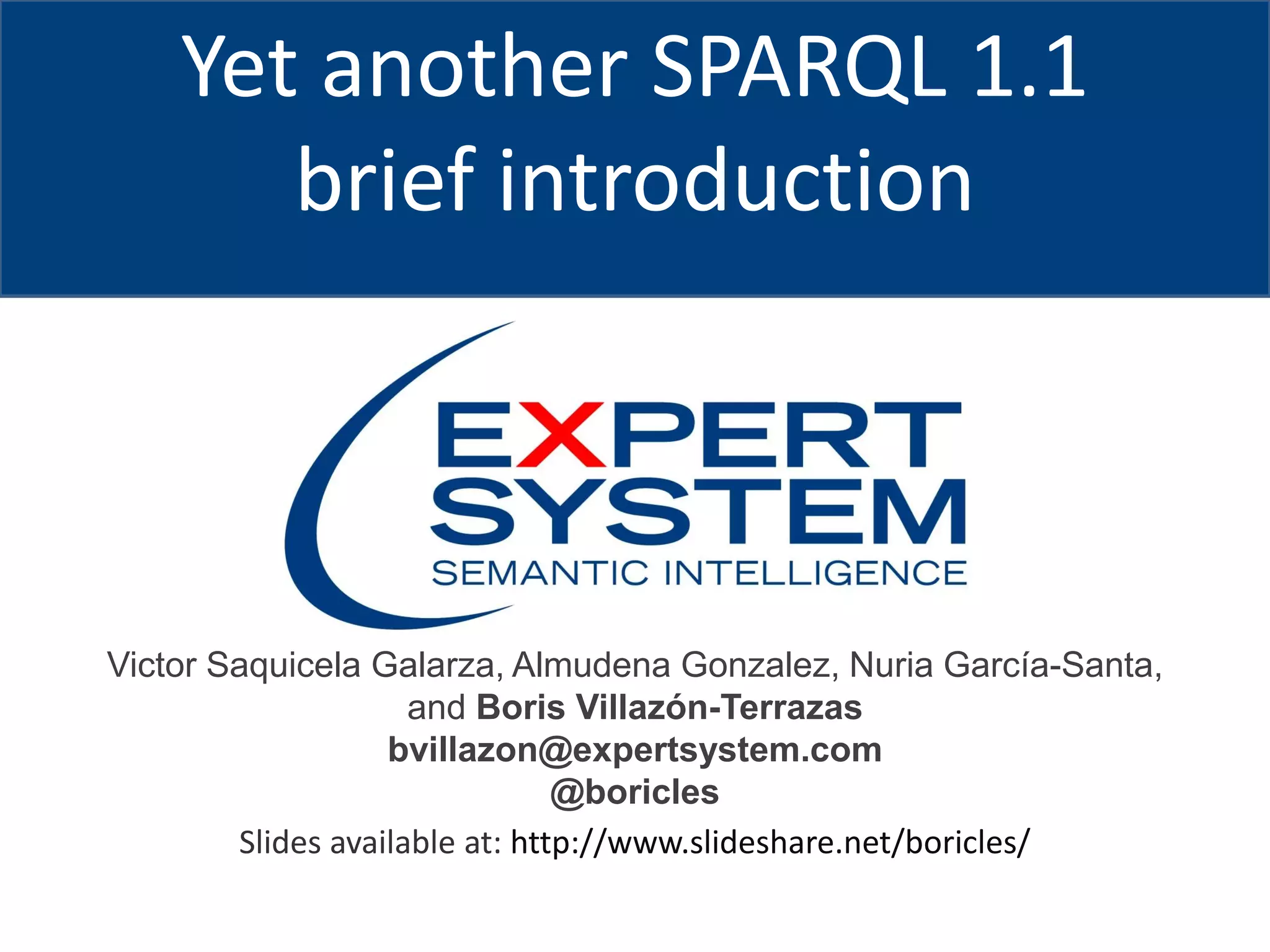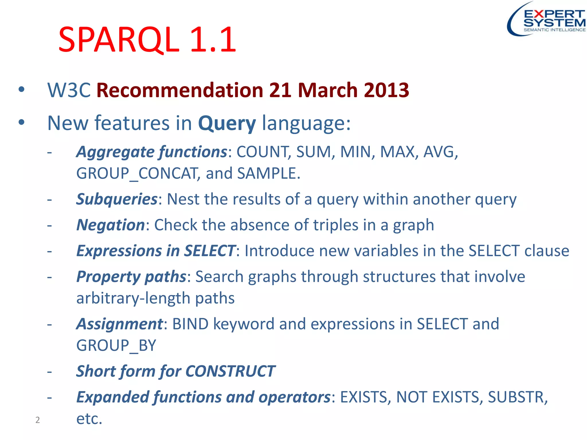 This document provides an introduction to SPARQL 1.1, including new features such as aggregate functions, subqueries, negation, property paths, and assignment. It also discusses SPARQL 1.1 update specifications and examples of SPARQL insert, delete, copy and federated queries. Basic property path examples are shown to retrieve superclasses and instances of classes.