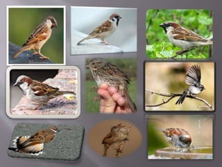 Sparrows are small, mostly brown birds that are very common throughout the world. They are divided into two main families - Old World Sparrows found in Europe, Asia and Africa, and New World Sparrows found in North and South America. While sparrows can be difficult to identify due to their dull plumage, understanding their behaviors such as flocking, foraging, diet and flight patterns can help in identification. Sparrows are also known for dust bathing and often live closely around human settlements. There are over 50 species of sparrows found in North America alone.