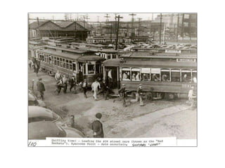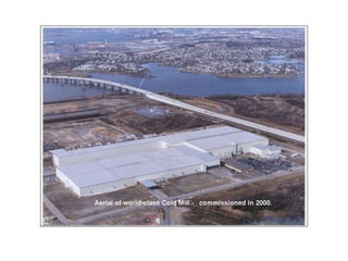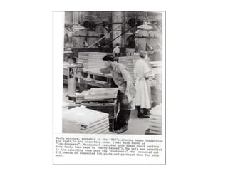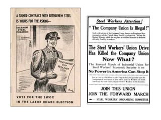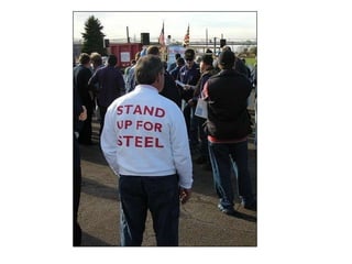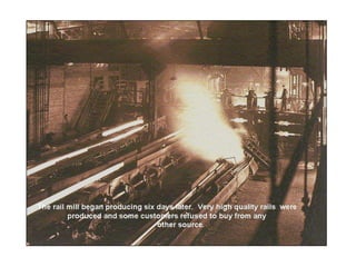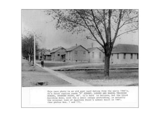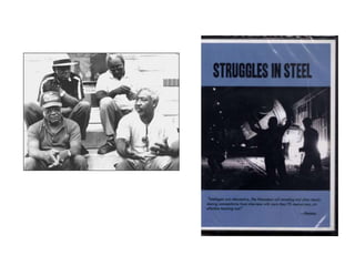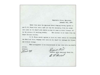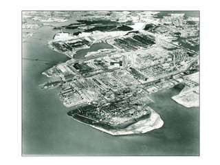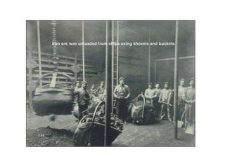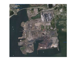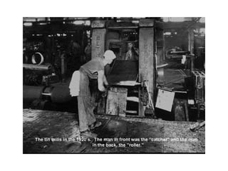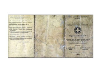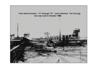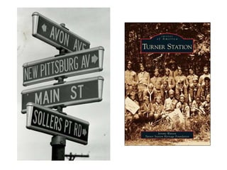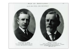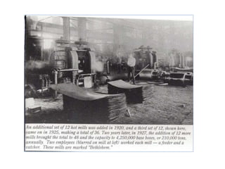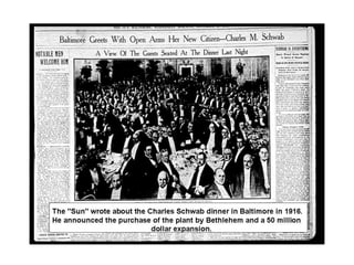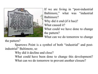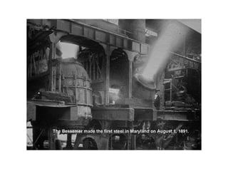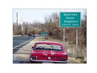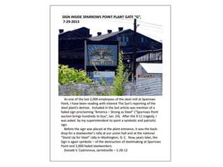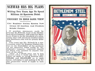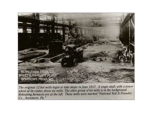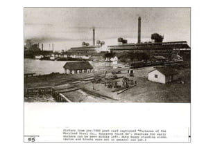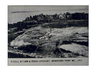 This document provides a history of Sparrows Point in Baltimore County, Maryland from the 1600s to the 1950s. It describes how the land was originally granted and settled by Native Americans and European colonists for farming and hunting. In the late 1800s, the land was purchased to establish the Maryland Steel Company (later Bethlehem Steel) due to its proximity to shipping routes for importing raw materials. The steel mill and company town grew dramatically through the early 20th century, employing thousands, with schools, housing, and other infrastructure for workers and their families. The document highlights some of the economic, social, and labor issues faced by the mill and workers over time, such as accidents, unions, strikes, and later challenges leading to