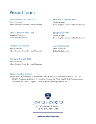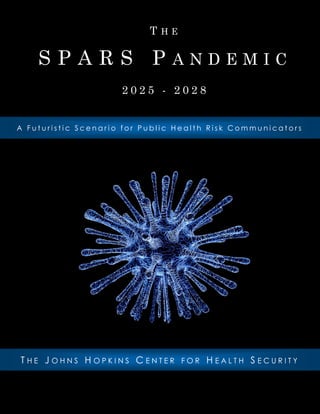 The document presents a hypothetical scenario set in the years 2025-2028 where a new infectious disease, called SPARS, emerges and develops into a global pandemic. In the scenario, access to information is widespread through new technologies, but society has also become highly fragmented, with isolated groups that mainly interact with those who share their own views. The scenario describes the outbreak of the SPARS virus and the challenges that arise in developing and distributing medical countermeasures, like vaccines and treatments, to the public, given the fragmented media and social landscapes. It is intended to illustrate communication dilemmas that may emerge during future public health emergencies concerning novel medical products.
