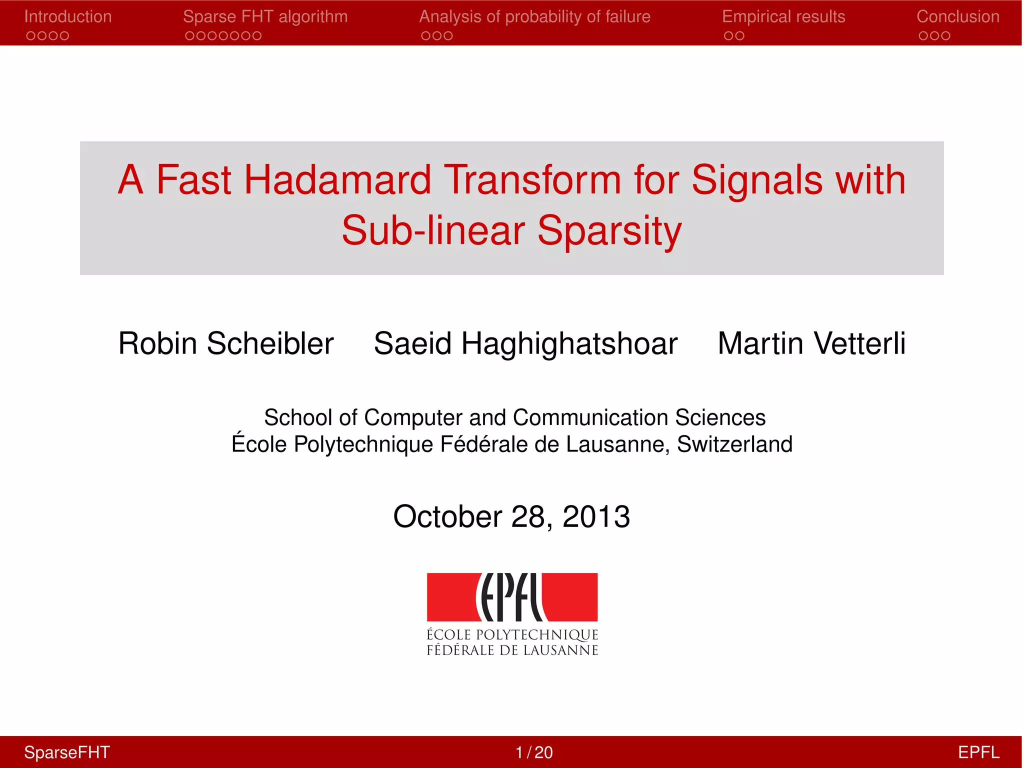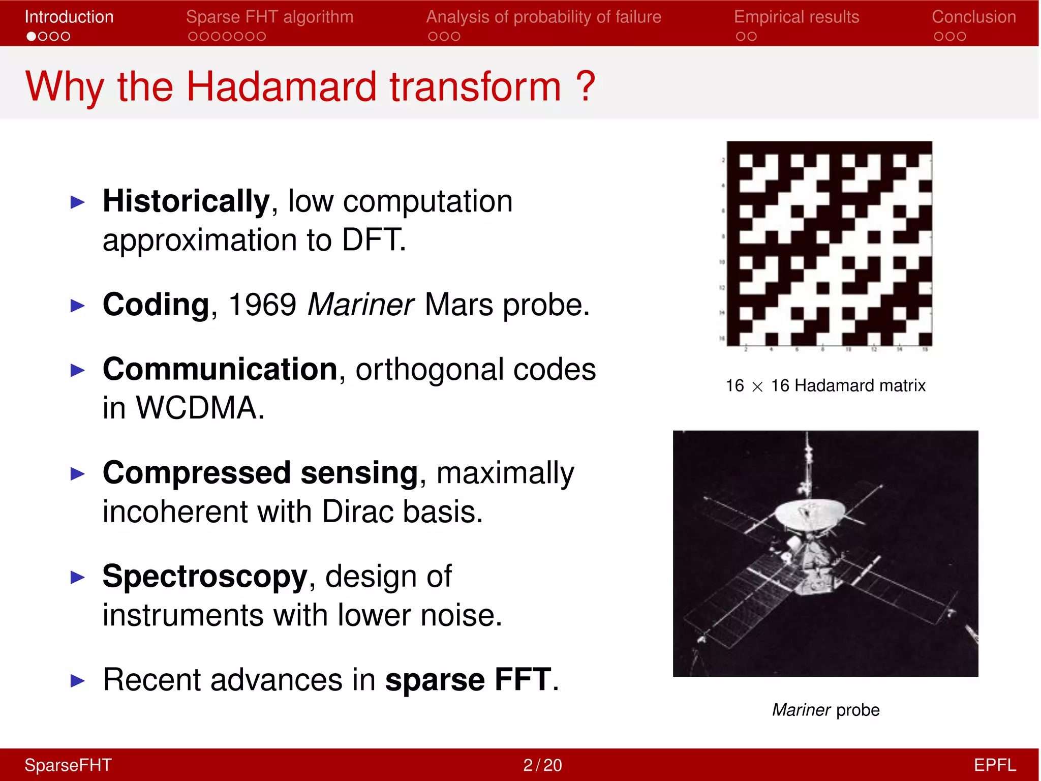 The document discusses the development of a Sparse Fast Hadamard Transform (Sparse FHT) algorithm which efficiently computes the non-zero coefficients of k-sparse signals in a universal setting. It highlights the algorithm's improvements over traditional Hadamard transforms, achieving faster computation times and reduced sample complexity. Empirical results and analyses of failure probabilities reinforce the efficacy of this new algorithm.